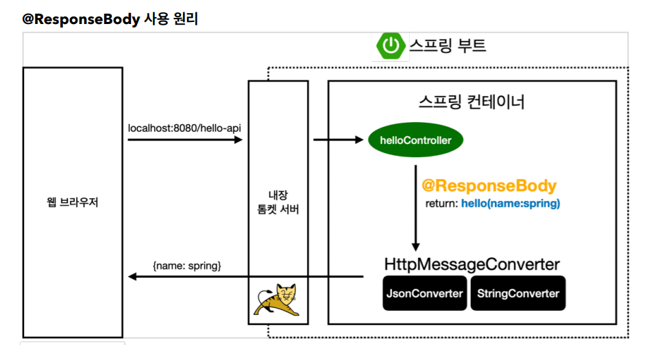@ResponseBody 의 의미 : Http에서 body 부에 이 Data를 직접 넣어주겠다는 뜻. 기본적으로 객체가 오면 Json방식으로 만들어서 넘긴다.